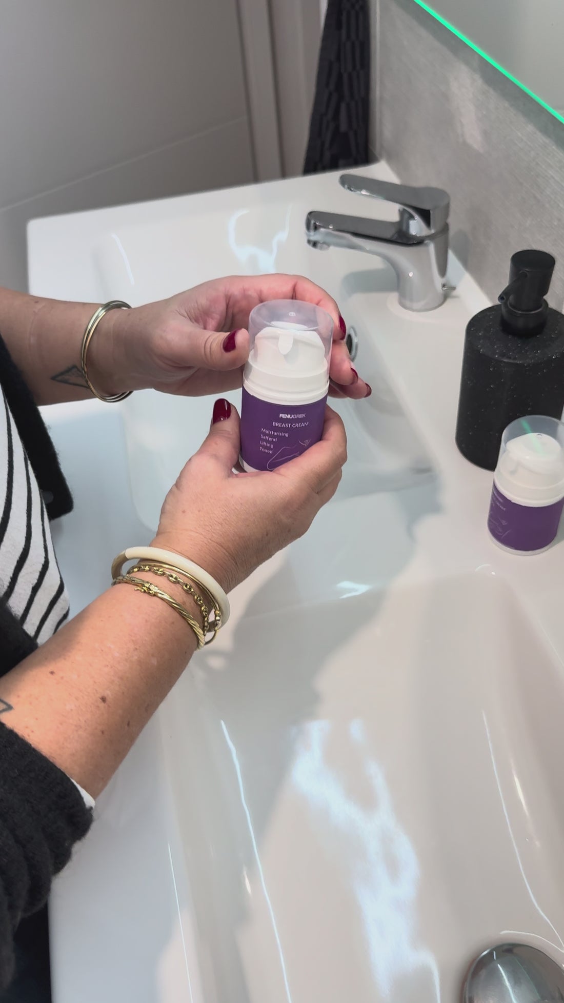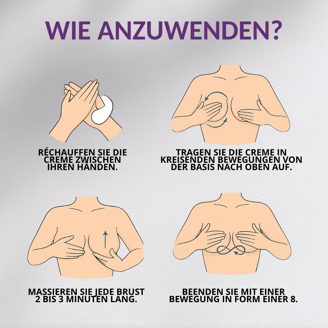 Tragen Sie eine kleine Menge auf die saubere Haut auf und massieren Sie jede Brust mit kreisenden, aufwärts gerichteten Bewegungen für 2 bis 3 Minuten.